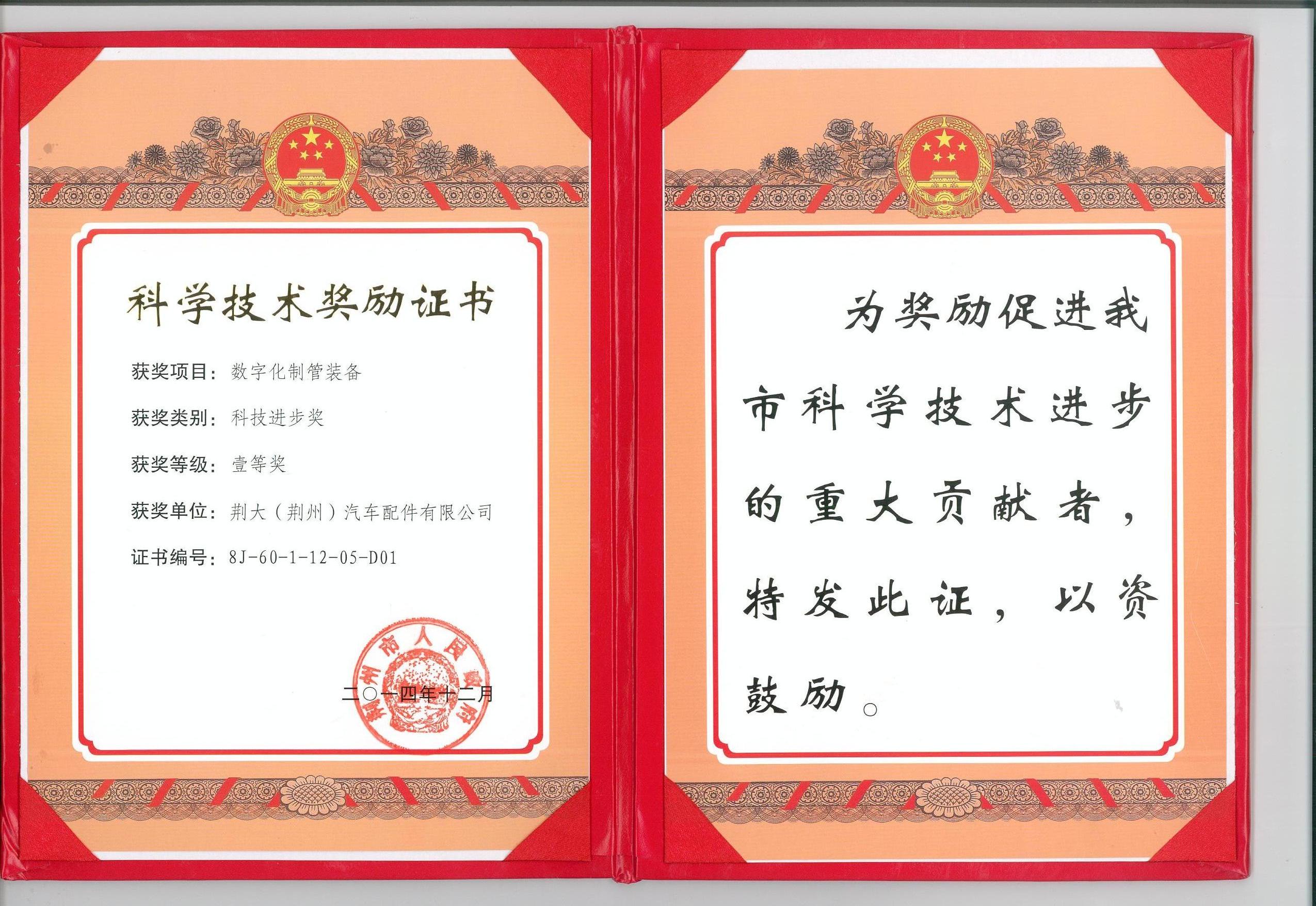 《数字化制管装备》获得2014年荆州市科技进步一等奖