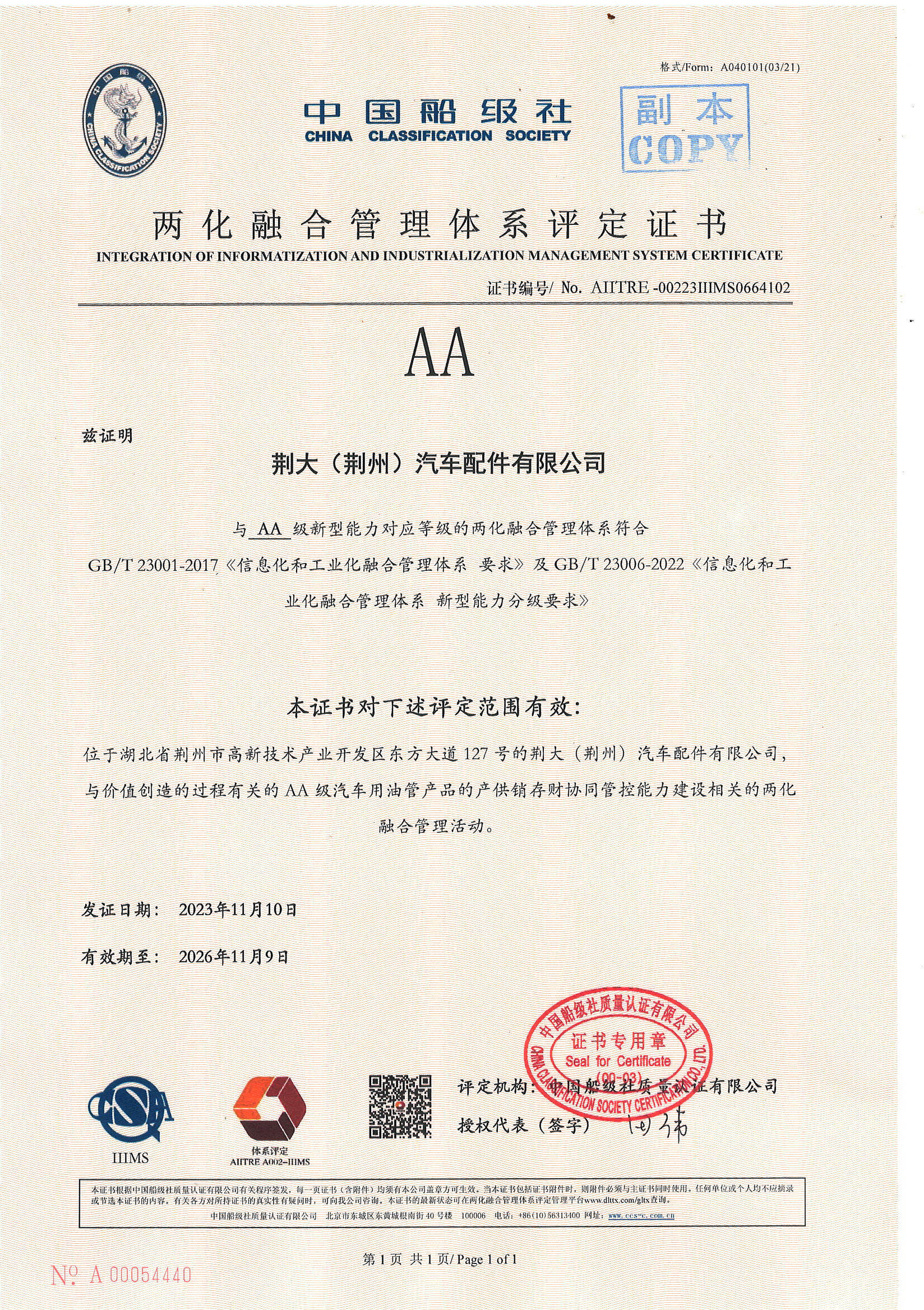 两化融合2A管理体系证书
