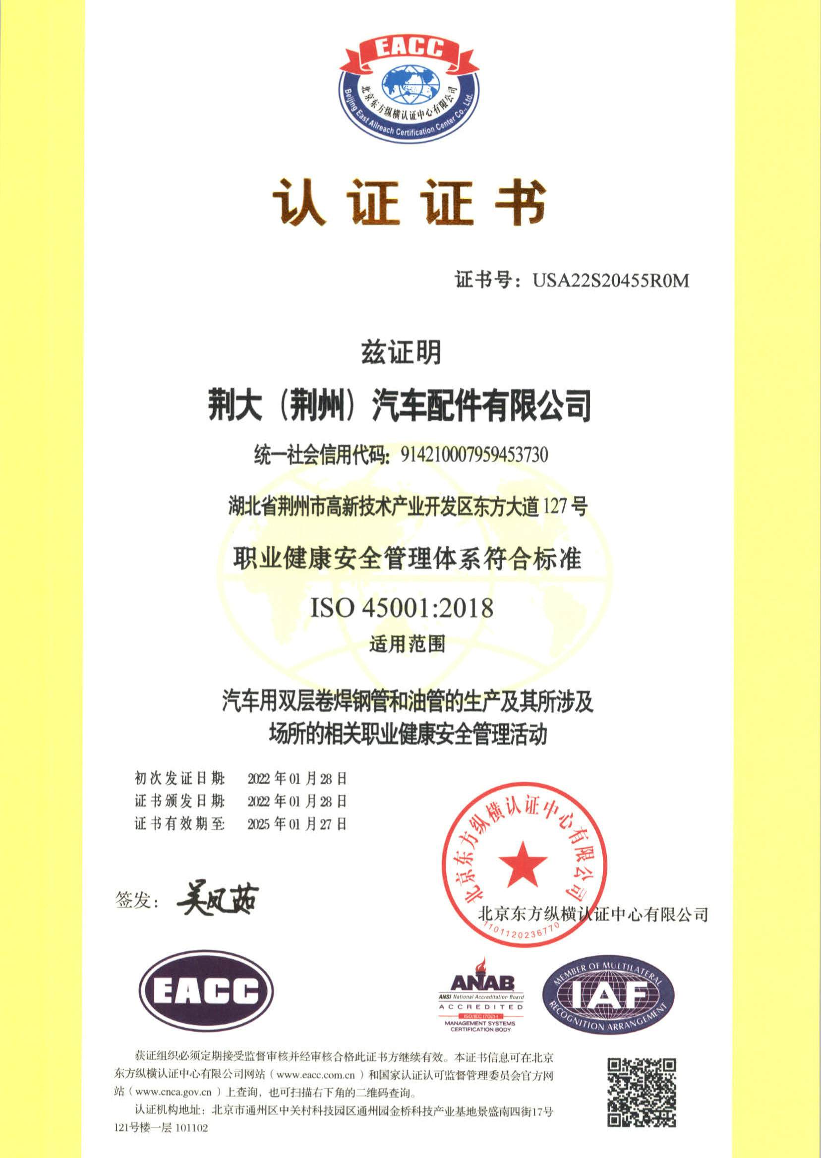职业健康安全管理体制证书